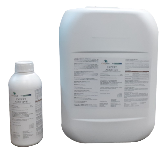 Expert Additive es una solución líquida que contiene potasio y algas para adicionar sobre fertilizantes y mejorar su capacidad de absorción por la planta.